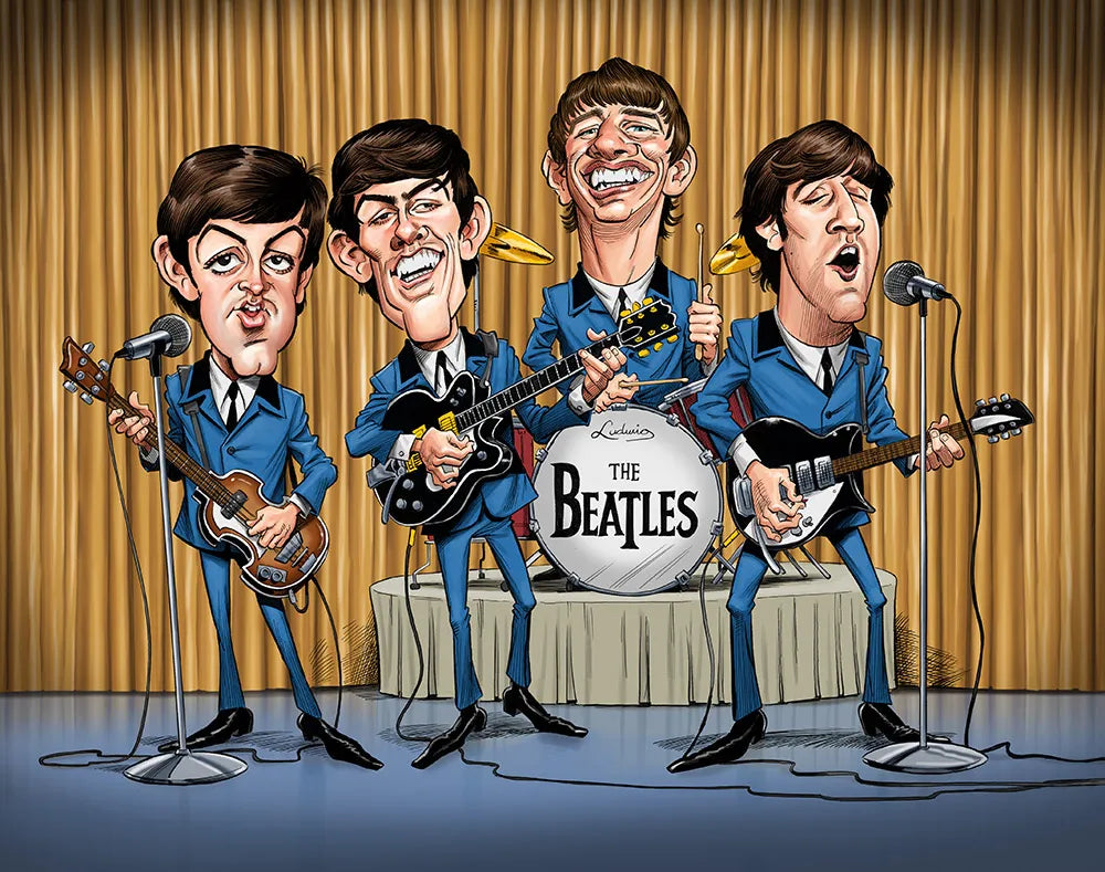 This full color Beatles caricature print lovingly satirizes the Fab Four in all their glory! The original caricature sketch was created for the “Tom’s Daily Coronacature” initiative, and Tom did this finished illustration in pen, ink and digital color.
