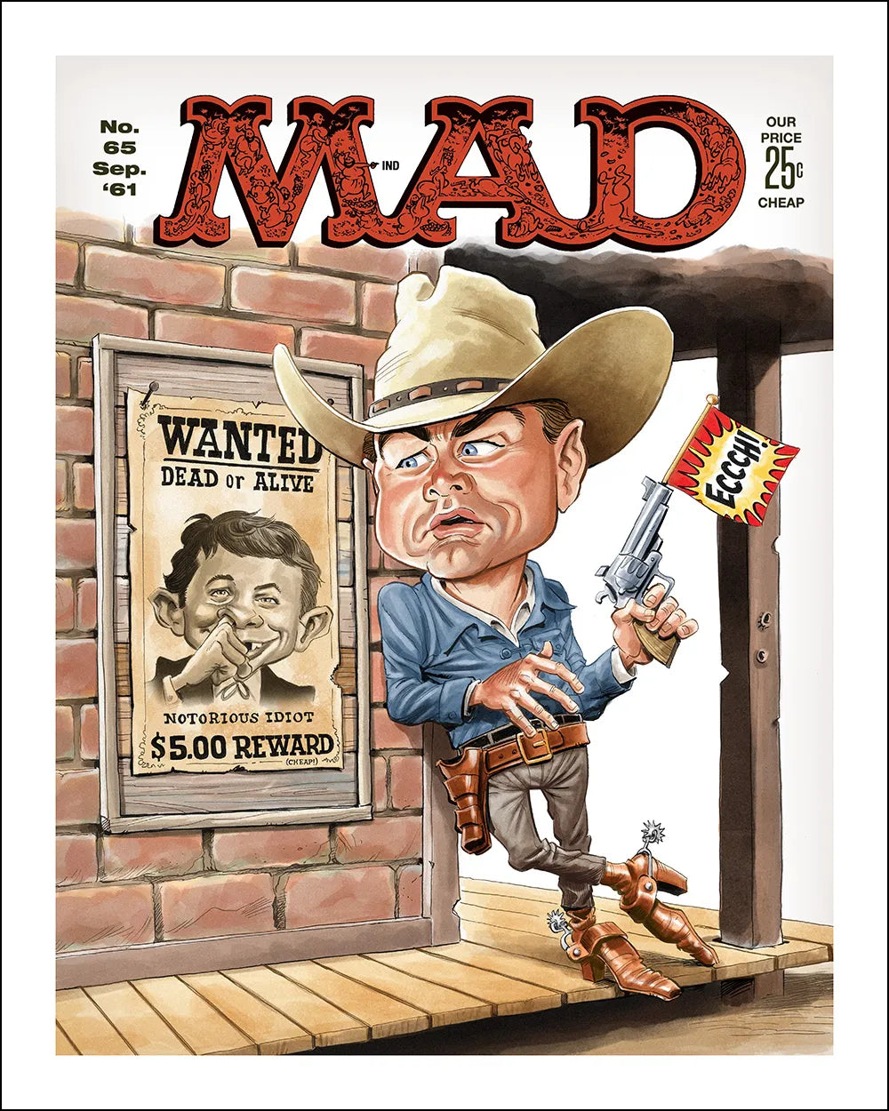 Fine art quality, large-sized giclee print of the “Bounty Law” MAD cover prop created for the Quentin Tarantino film “Once Upon a Time in Hollywood”, and shown prominently in the movie. This is NOT a print of the Oct 2019 MAD #9 cover but a reproduction of the actual movie prop as it was seen on screen in “Once Upon a Time in Hollywood”, complete with faux vintage edging, the 1961 cover date, issue number, and pricing. The cover features Leonardo DiCaprio in a vintage Jack Davis homage style meant to look like an early 60’s MAD cover.