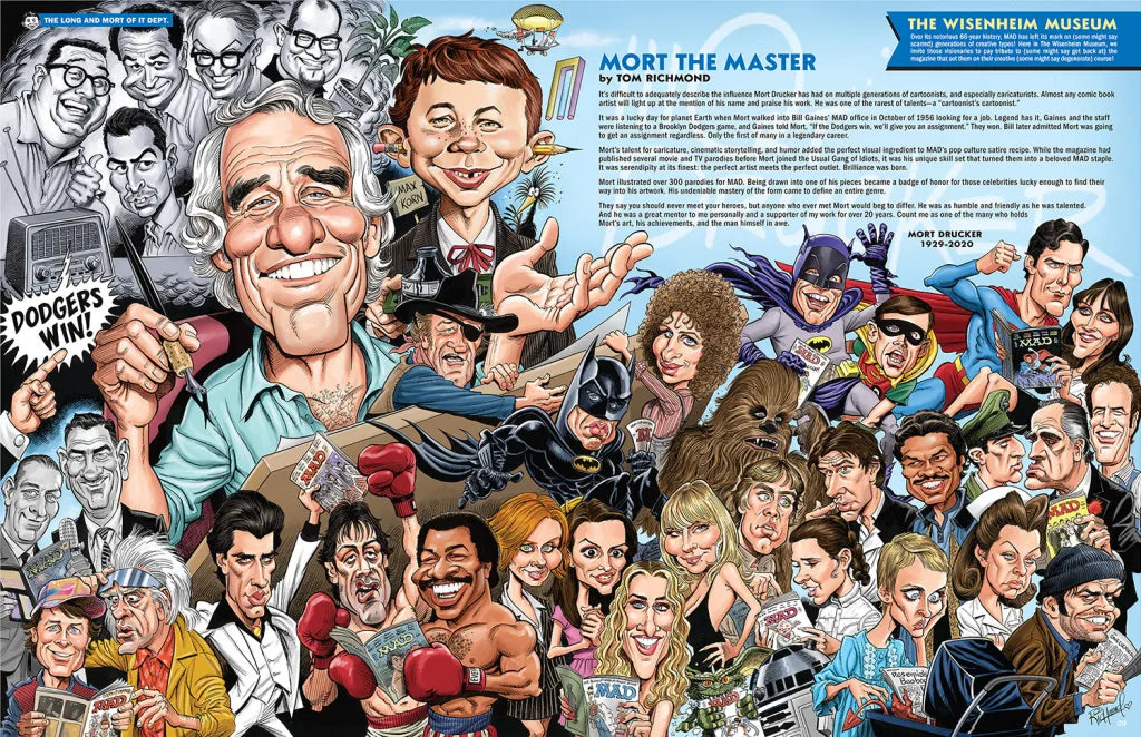 Full color slightly oversized print of Tom's two page tribute to the great Mort Drucker, originally printed in MAD #15, October 2020. Tom both wrote and did the art for this installment of "The Wisenheim Museum". Printed "on demand" on heavyweight archival matte paper, and signed by Tom!