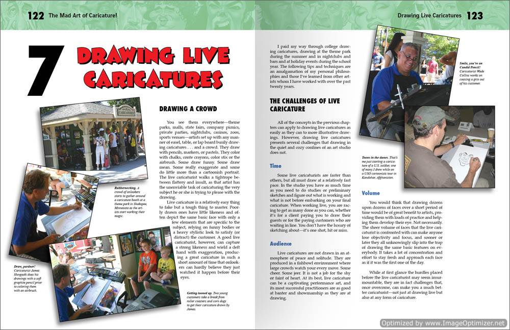 The Mad Art of Caricature explains not just how to draw caricatures, but the theories and thinking behind how to create them. It examines what really makes a caricature successful, what to look for in a face, and how to draw it. The reader will also learn how to apply this skill, whether it’s drawing live, theme-park-style caricatures, or creating caricature for publication work. Loaded with everything from basic theories and drawing instruction to professional tips and tricks, this book contains something for novices and experts alike.