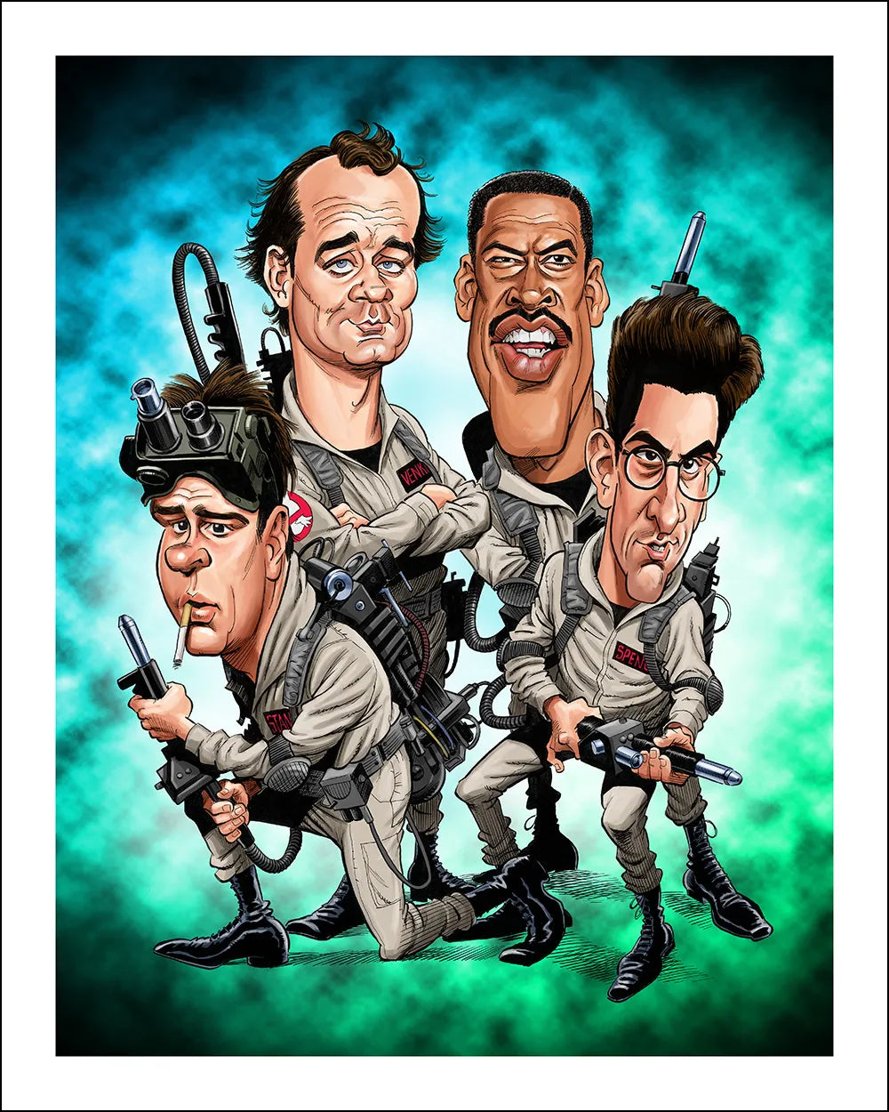 Fine art quality, large-sized giclee print of my “Who Ya Gonna Call” caricature homage to the Ghostbusters. This full color caricature giclee print lovingly captures the original movie Ghostbusters crew in all their goofy glory! The original caricature sketch was created for the “Tom’s Daily Coronacature” initiative, and Tom did this finished illustration in pen, ink and digital color.